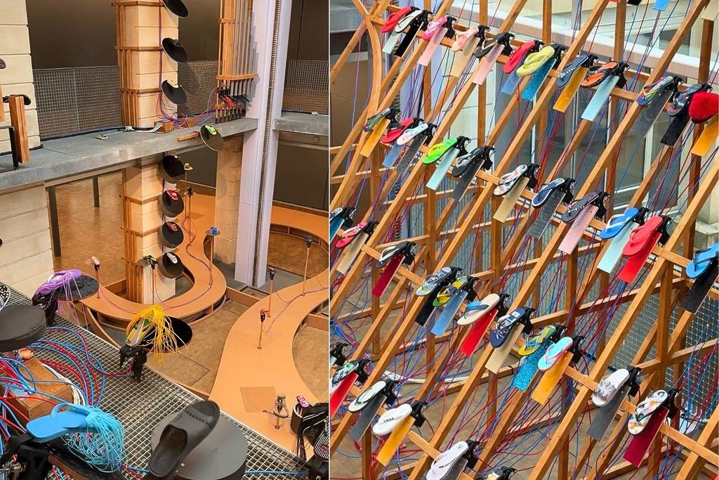 L’installation est spectaculaire : des centaines de tongs sont suspendues, fixées sur des structures en bois et reliées à un système complexe de mécanismes et de fils électriques. Chaque claquette est actionnée par un dispositif qui lui est propre, lui permettant de frapper une surface et de produire un son unique. C’est un véritable concert de percussions où le bois, le caoutchouc et les tuyaux métalliques s’unissent pour créer une œuvre sonore hypnotique.