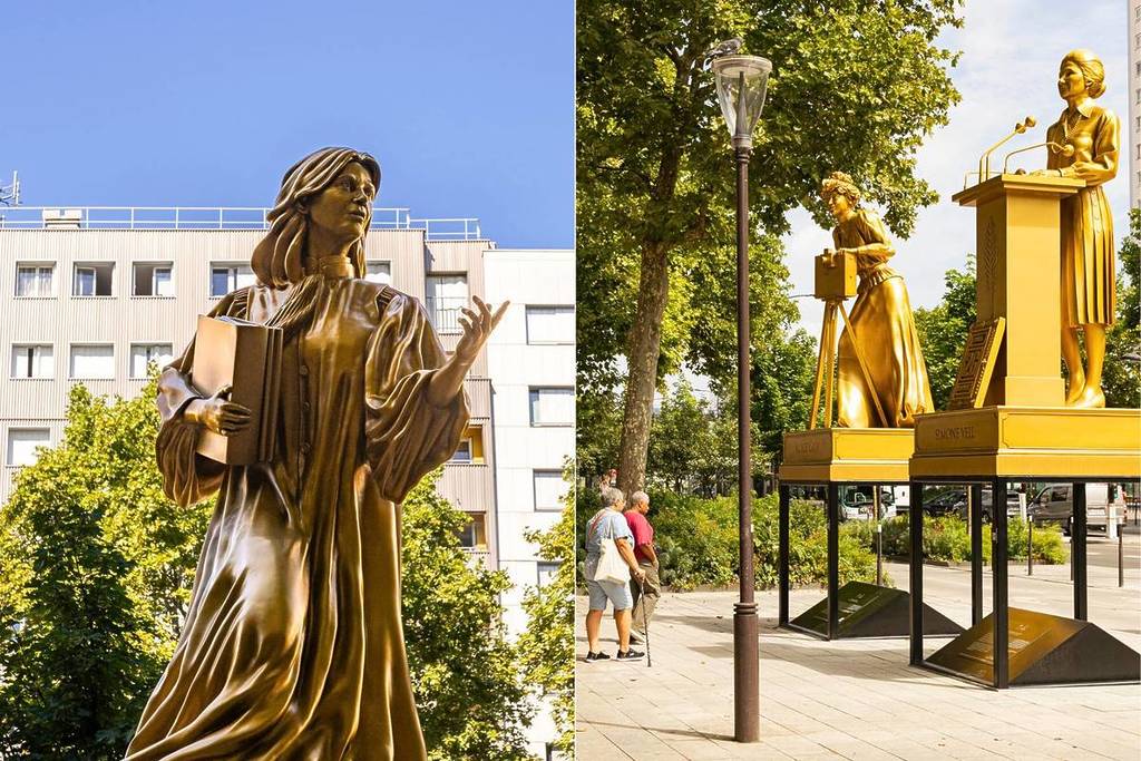 Die vergoldeten Statuen von Simone Veil, Simone de Beauvoir und Olympe de Gouges, die im öffentlichen Raum aufgestellt sind