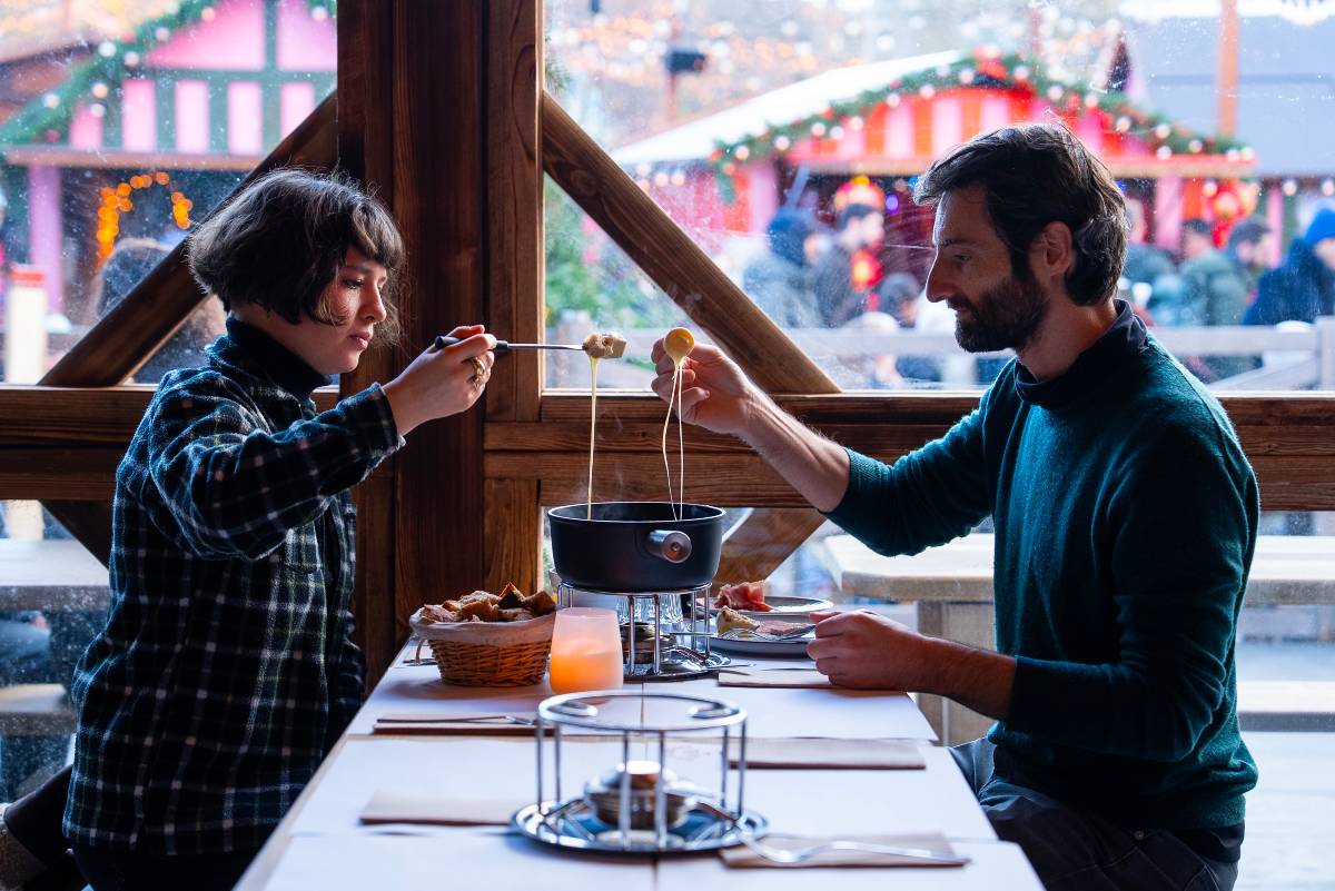 Este año, el Chalet de la Fondue de Zúrich es el lugar emblemático del Mercado: un restaurante con capacidad para más de 100 comensales situado en el centro del pueblo, donde podrá degustar fondues y especialidades suizas en un ambiente cálido y acogedor. El menú ha sido diseñado por el chef Benjamin Plsek , galardonado con una estrella Michelin , y ofrece diversas variaciones de las fondues tradicionales. Auténtico símbolo del compartir y la convivencia, este chalet es el punto de encuentro imprescindible del mercado, un lugar donde prolongar el paseo degustando un reconfortante plato y un vaso de vino caliente.
