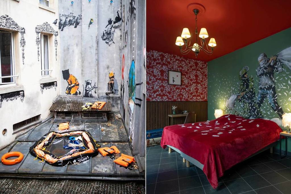 Situé à deux pas du musée consacré aux reproductions des œuvres les plus emblématiques du street-artist, le Walled Off Hôtel est la copie parfaite d’un hôtel ouvert par l’artiste à Bethléem en 2017. Ce dernier avait la particularité d’offrir « la pire vue du monde » : celle du mur séparant Israël de la Palestine. Dans la reproduction parisienne, point de mur mais des éléments de décoration reproduits à l’identique : tableaux, pochoirs, lampes… rien n’a été laissé au hasard.