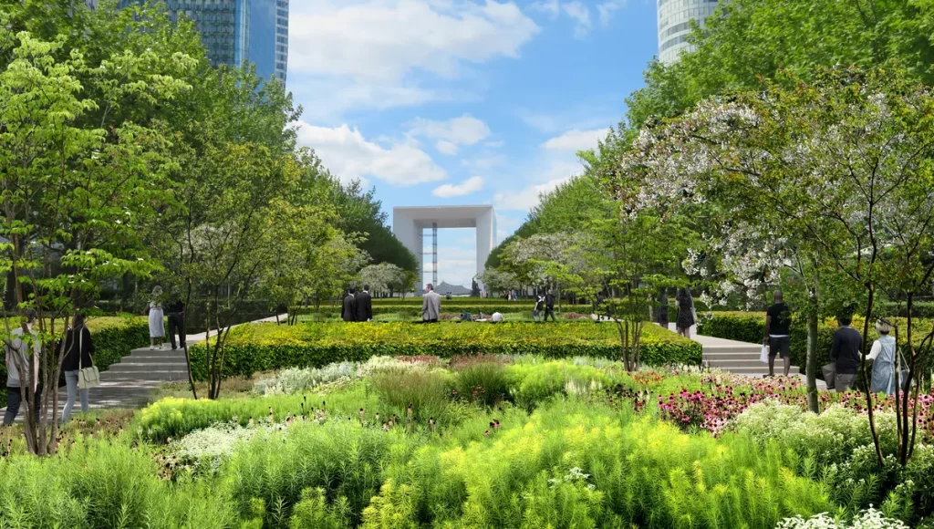 In 2028 kunnen we afscheid nemen van de tegels van de esplanade van La Défense en het veel te minerale uiterlijk ervan, want een echt park van 5 ha zal de plek volledig opnieuw vormgeven. Over twee jaar kunnen de Parijzenaars wandelen over een volledig begroeide ruimte van meer dan 600 meter lang, ontworpen om elkaar te ontmoeten. Deze historische as zal verschillende pleinen, begroeide wandelpaden, sportfaciliteiten en een speeltuin voor het hele gezin omvatten.