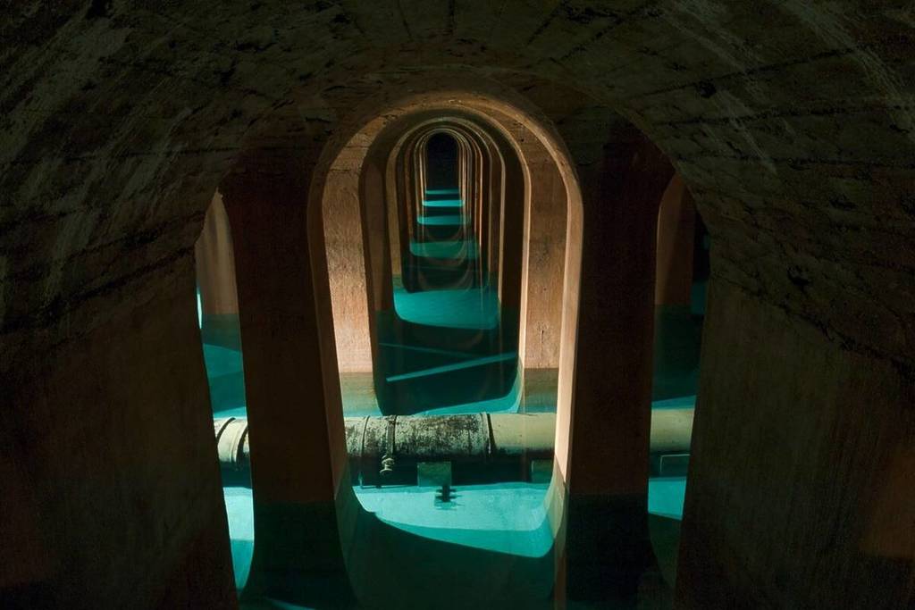Entièrement souterrain, il peut contenir environ 200 000 m3 d’eau. À l’intérieur, plus de 1 800 piliers soutiennent des voûtes en maçonnerie, formant un ensemble monumental souvent comparé à une cathédrale souterraine. L’eau y est stockée avant d’être redistribuée vers les habitations.